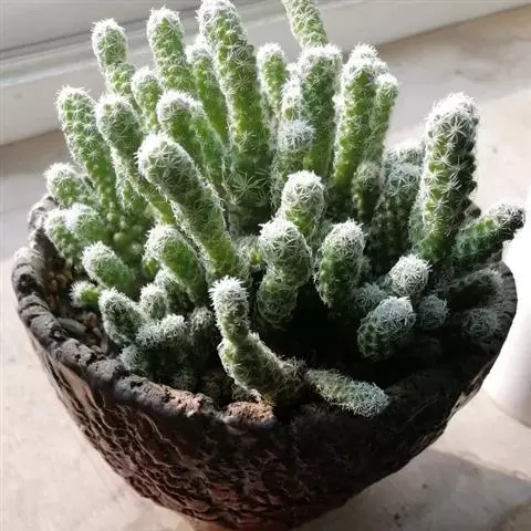 仙人球类,喜阳,白色软刺。不要怕晒坏,土表干透后,阴处浇水。长江流域冬天放入室内,室温不低于5度。用土为砂质土壤。
