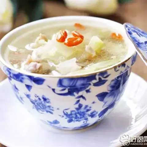 原料:冬瓜100克,瘦羊肉80克,枸杞3克,生姜10克,葱10克。