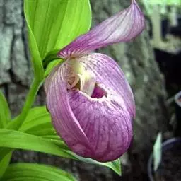 大花杓兰因其形状酷似一个口小肚大的囊袋,又名“大口袋兰”。花体呈紫红色,花朵直径5厘米至6厘米,…