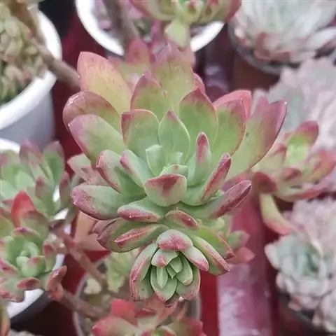 女雏是景天科石莲花属的多肉植物。特征是小巧的株形和橙粉色叶缘。极易生侧芽,…