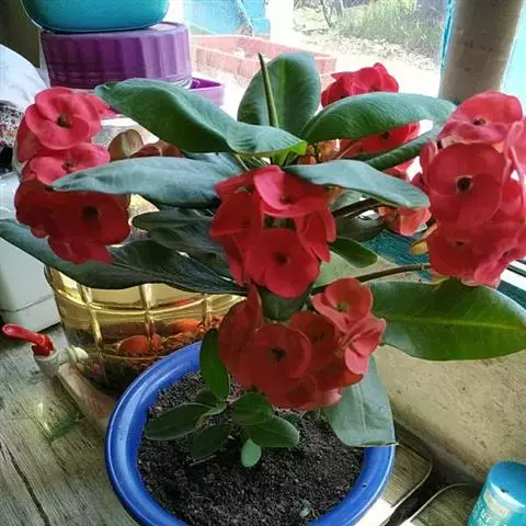 虎刺梅:别称铁海棠,是蔓生灌木植物。茎多分枝,长60-100厘米,直径5-10毫米,具纵棱,密生硬…