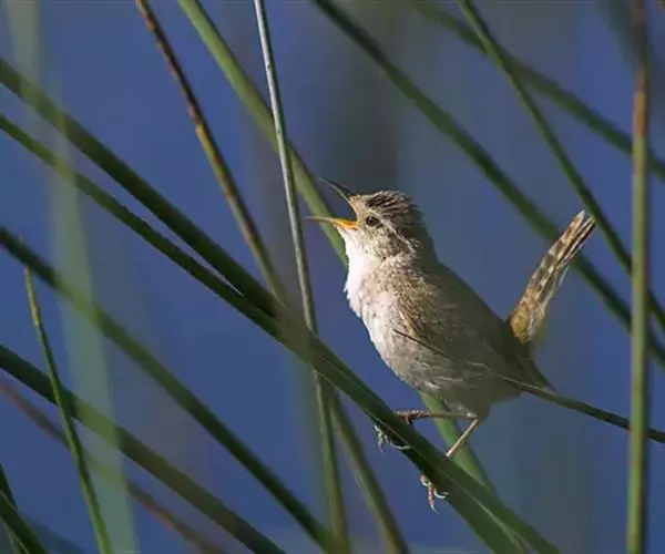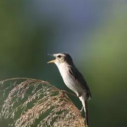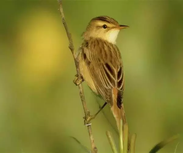 水蒲苇莺(学名:Acrocephalus schoenobaenus):小型鸟类,体长12-14厘米。雌雄两性羽色相似。上体褐色,头顶和背具粗著的黑褐色轴纹;腰和尾上覆羽较淡棕色,无轴纹;头顶黑褐色轴纹常沿纵轴排列成行;眉纹皮黄色或灰白色,宽阔而明显;贯眼纹黑褐色;耳下覆羽较四周羽毛色暗;两翅和尾褐色而沾灰,外翈羽缘红褐色;下体白色,或淡土黄色;两胁较暗;腋羽白色,有时稍沾土黄色;翅下覆羽淡银灰色,羽缘土白色。