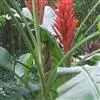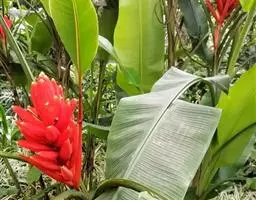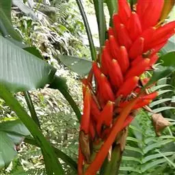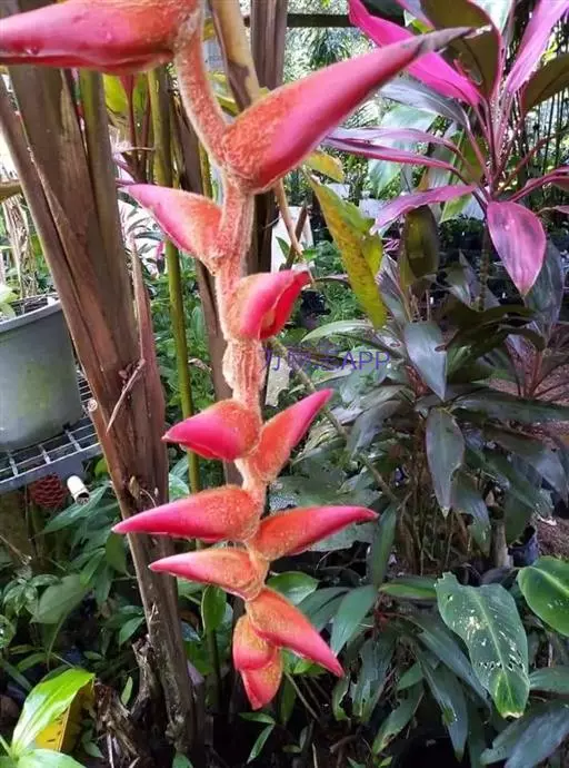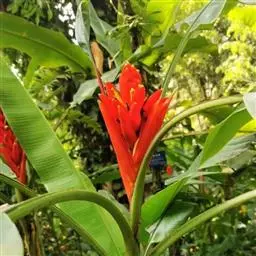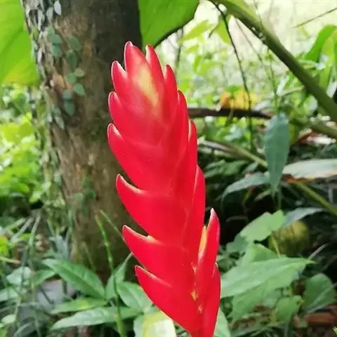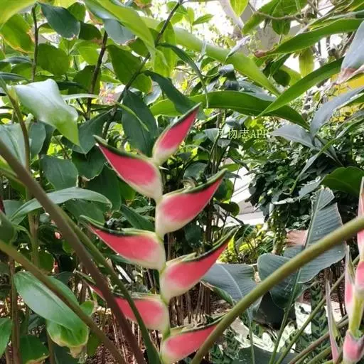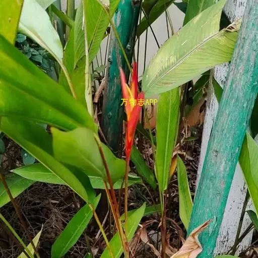 蝎尾蕉(学名:Heliconia metallica Planch. et Linden ex Hook. f.):芭蕉科,蝎尾蕉属多年生草本植物。株高可达260厘米。叶片长圆形,叶面绿色,叶背亮紫色;顶生花序,直立,薄被短柔毛;苞片绿色,开放时突露,花被片红色,顶端绿色,狭圆柱形,果三棱形,灰蓝色,有种子不多于3颗。