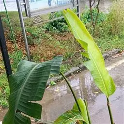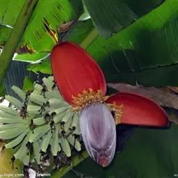红蕉,假茎高1-2米。叶片长圆形,长1.8-2.2米,宽68-80厘米,叶面黄绿色,叶背淡黄绿色,…