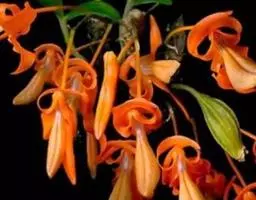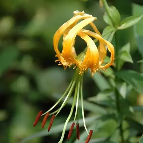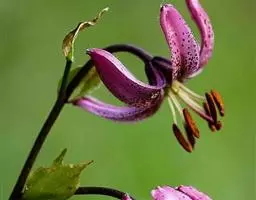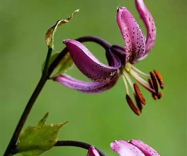 总状花序有花1-6朵;苞片叶状,条形,长约2厘米,顶端不加厚;花梗长6-18厘米,直立,先端弯曲;花下垂,有香味;花被片披针形,反卷,长3.5-4.5厘米,宽8-10毫米,先端钝,淡紫红色,下部有深紫色斑点,蜜腺两边密生乳头状突起;花丝长约2厘米,无毛,花药长1.4厘米,黑紫色;子房圆柱形,长8-10毫米,宽2毫米;花柱长1.5-1.7厘米。花期7月。