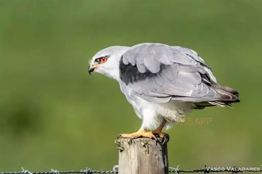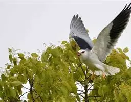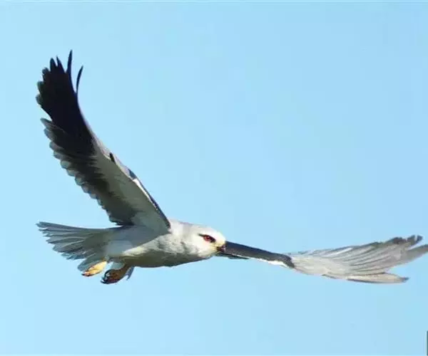 黑翅鸢(学名:Elanus caeruleus):小型猛禽,体长约33厘米。上体蓝灰色,下体白色。眼先和眼周具黑斑,肩部亦有黑斑,飞翔时初级飞羽下面黑色,和白色的下体形成鲜明对照。尾较短,平尾,中间稍凹,呈浅叉状。脚黄色,嘴黑色。常在空中翱翔,间或进行滑翔。