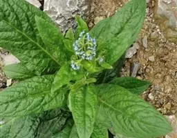 多年生草本。茎直立或斜升,基部木质化,不分枝或茎上部分枝,密生黄色短伏毛及开展的稀疏硬毛。茎下部叶具长柄,中部及上部叶具短柄;叶片卵形或长圆状披针形,长4-8厘米,宽1.5-4厘米,先端渐尖,基部宽楔形,上面粗糙,被硬毛及伏毛,下面柔软,密生柔毛,侧脉8-9对,上下两面均明显;叶柄长0.5-1.5厘米,密生硬毛及伏毛。镰状聚伞花序顶生,集为伞房状,花期密集,直径4-6厘米,花后开展,直径约10厘米;花无梗或稀具短梗。