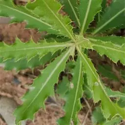 茎单生,坚硬,具槽沟,直立,高达1米,基部被疏生长柔毛,后变无毛,直径约5毫米;中部叶疏生;下部茎叶具长柄;叶片干时近膜质,全形圆形,直径30--40厘米,基部宽盾形(达2厘米),掌状深裂;裂片长圆状披针形,下部的裂片有时不分裂,其余的裂片浅裂,或线状披针形,宽2—3厘米,顶端尖,稀二浅裂边缘有疏锯齿,具小尖头,主脉掌状,近平行,上面绿色,无毛,下面灰绿色,被短柔毛,后变无毛;叶脉凸起,具明显的网脉;叶柄长3—8厘米,基部半抱茎;上部茎叶掌状深裂或2浅裂,叶柄短,最上部的叶苞片状,线状披针形,长达5厘米,具疏锯齿。头状花序盘状,多数在茎端排成复伞房状;分枝开展,长2—3,稀达8厘米,被疏短柔毛;花序梗长达6毫米,具3--4个线状披针小苞片形。总苞圆柱形;总苞片5,长圆状披针形,长约10毫米,宽2—3.5毫米,顶端钝或尖,边缘多少膜质,背面具细条纹,顶端疏长柔毛。小花约10,全部管状,结实;花冠长9—10毫米;檐部钟状,长约7毫米;裂片披针形,长2毫米,顶端有微毛;花药伸出花冠,长5毫米,基部箭形;花柱分枝外弯,顶端被笔状微毛。瘦果圆柱形,长4—5毫米,无毛,具肋;冠毛白色或变红色。主要价值花期2—8月。