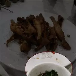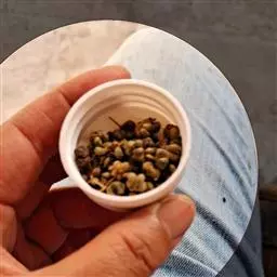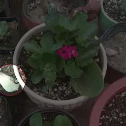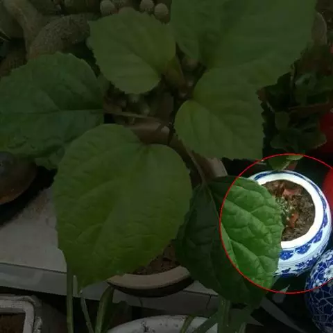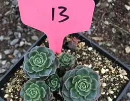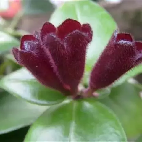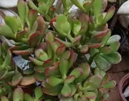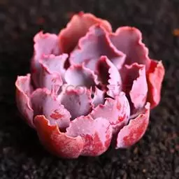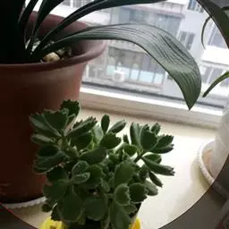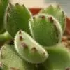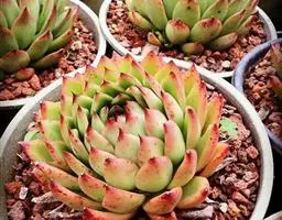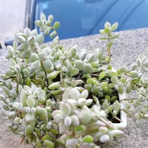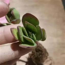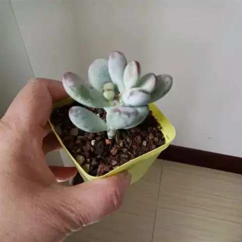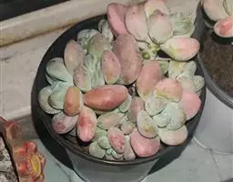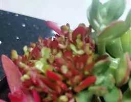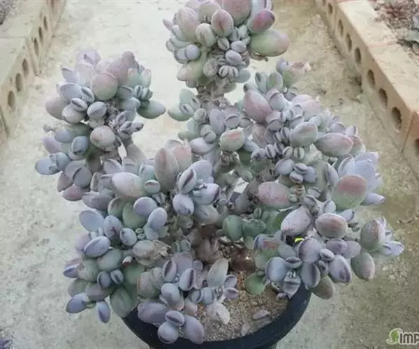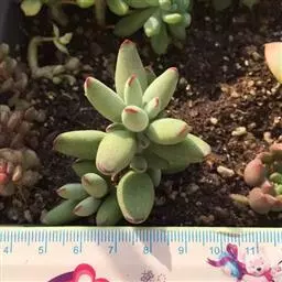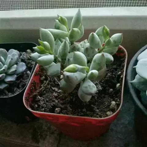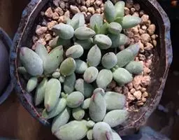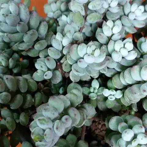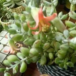 乒乓福娘,植株叶片退化成扁卵状,植株为直立的肉质灌木,能够长高。叶片对生,扁卵型至圆卵形,叶片顶端紫红圆叶尖,叶面有一层白粉。强光下叶片的顶端边缘会较红。初夏开花,聚伞状圆锥花序,花序较高,小花管状下垂,花开橙红色,先端五裂,花蕾看起来象一个个挂着的小辣椒。