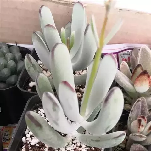 福娘为景天科银波锦属的肉质草本植物。对生的叶片呈短棒状,叶色灰绿,表覆白粉,叶缘外围镶着紫红色,…