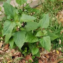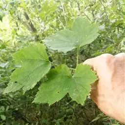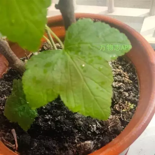 叶近圆形,长4-9厘米,宽4.5-11厘米,基部心脏形,上面暗绿色,幼时微具短柔毛,老时脱落,下面被短柔毛和黄色腺体,掌状3-5浅裂,裂片宽三角形,先端急尖,顶生裂片稍长于侧生裂片,边缘具不规则粗锐锯齿;叶柄长1-4厘米,具短柔毛,偶而疏生腺体,有时基部具少数羽状毛。
