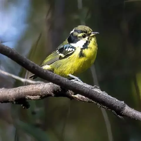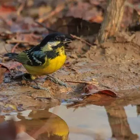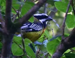 黄颊山雀(学名:Parus spilonotus)小型鸟类,体长12~14厘米。头顶和羽冠黑色,前额、眼先、头侧和枕鲜黄色,眼后有一黑纹。上背黄绿色、羽缘黑色,下背绿灰色(西藏亚种) ,或上背黑色而具蓝灰色轴纹,下背蓝灰色 (华南亚种) 。颏、喉、胸黑色并沿腹中部延伸至尾下覆羽,形成一条宽阔的黑色纵带,纵带两侧为黄绿色 (西藏亚种) 或蓝灰色 (华南亚种)。