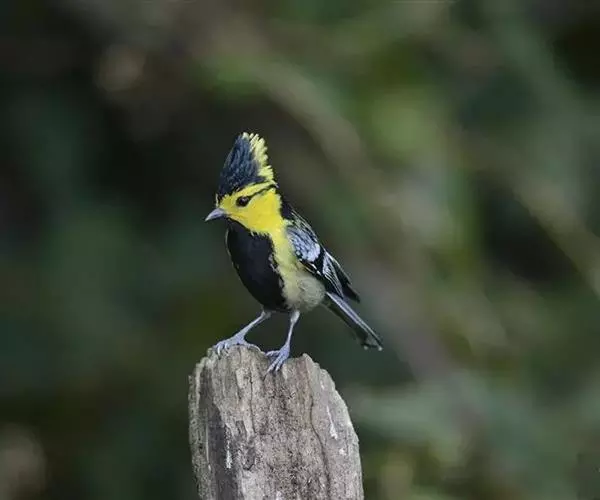 雄鸟前额、头顶和羽冠黑色具蓝色金属光泽,额基、眼先、眉纹、脸颊、耳羽等头侧和颈侧前部鲜黄色,后枕羽冠先端和后枕亦为鲜黄色,在后颈形成一黄色块斑,眼后有一辉蓝黑色纹沿颈侧弯向下。上背黄绿色,羽缘黑色,下背绿灰色,腰黄绿色(西藏亚种);或上背铅黑色具蓝灰色轴纹,下背和腰蓝灰色(华南亚种) 。尾上覆羽暗蓝灰色,尾黑色,外翈具蓝灰色羽缘,外侧尾羽具白色端斑,最外侧一对尾羽外翈几全白色。两翅覆羽黑色,小覆羽具蓝灰色端斑,中覆羽和大覆羽具白色端斑,在翅上形成两道白色翅斑,尤以大覆羽白色端斑较宽、形成的白色翅斑亦更明显。飞羽亦为黑色,除第一、二枚初级飞羽外,其余初级飞羽外翈蓝灰色,基部白色,向端部逐渐转为窄的白色羽缘;次级飞羽外翈羽缘蓝灰色,羽端白色;三级飞羽具宽的白色端斑。下体颏、喉、胸黑色,有的微具金属光泽,腹中央有一条宽的黑色纵带,前端与黑色胸相连,后端延伸至肛周;尾下覆羽白色,有的杂有灰色;胸侧和腹侧黄色、两胁黄绿色(西藏亚种)或胸侧白色,腹侧和两胁蓝灰色(华南亚种)。