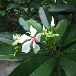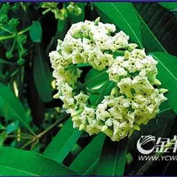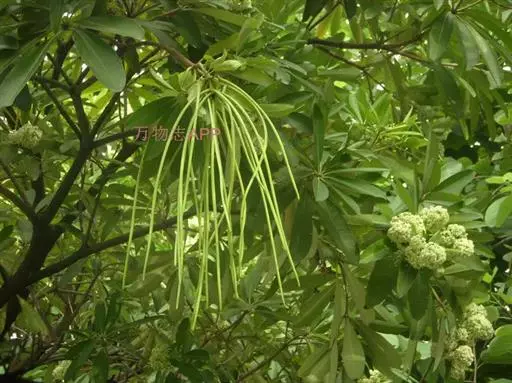 盆架树(Winchia calophylla A. DC. ):常绿乔木,高达30米,直径达1.2米;枝轮生,树皮淡黄色至灰黄色,具纵裂条纹,内皮黄白色;小枝绿色,嫩时稜柱形,具纵沟,老时成圆筒形,落叶痕明显。叶3-4片轮生,长圆状椭圆形,顶端渐尖呈尾状或急尖,叶面亮绿色,叶背浅绿色稍带灰白色,两面无毛。花多朵集成顶生聚伞花序,花冠高脚碟状,花冠筒圆筒形,裂片广椭圆形,白色,长3-6毫米,宽约2.5毫米,外面被微毛,内面被柔毛。种子长椭圆形,扁平,两端被棕黄色的缘毛。花期4-7月,果期8-12月。