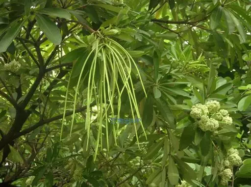 秋季开花,绿白色。果实长线形,枝条开展呈水平状,层层有序,树冠优美,为高级的庭园绿荫观赏树及行道树。但是要注意的是开花后的味道很浓,建议不要在同一地方种植多株。有一定的抗风和耐污染能力,盆架树树形美观,叶色亮绿,又有一定的抗风能力,是华南地区城市绿化的好树种,常用于公园观赏或行道树用。