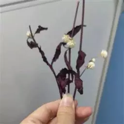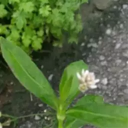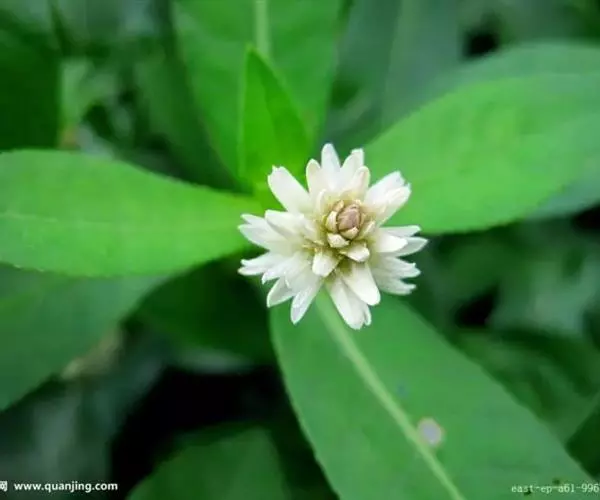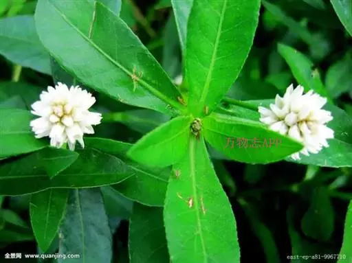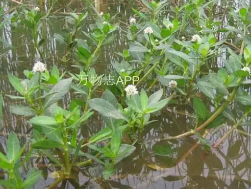 鉴别特征:水生型植株无根毛,茎长达1.5~2.5m;陆生型植株可形成 喜旱莲子草 直径达1cm左右的肉质贮藏根,有根毛,株高一般30cm,茎杆坚实,节间最长15cm,直径3~5mm,髓腔较小。叶对生,长圆形至倒卵状披针形。头状花序具长1.5~3cm的总梗。花白色或略带粉红,雄蕊5。
