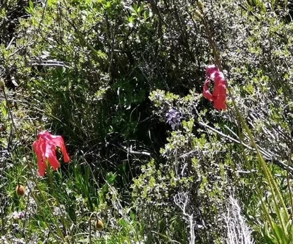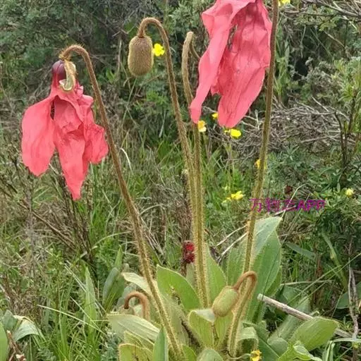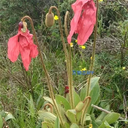 花葶1-6,从莲座叶丛中生出,通常具肋,被棕黄色、具分枝且反折的刚毛。花单生于基生花葶上,下垂:花芽卵形;萼片卵形,长1.5-4厘米,外面密被淡黄色或棕褐色、具分枝的刚毛;花瓣4,有时6,椭圆形,长3-10 厘米,宽1.5-5厘米,先端急尖或圆,深红色:花丝条形,长1-3厘米,宽2-2.5毫米,扁平,粉红色,花药长圆形,长3-4毫米,黄色;子房宽长圆形或卵形,长1-3厘米。密被淡黄色、具分枝的刚毛,花柱极短,柱头4-6圆裂。蒴果椭圆状长圆形,长1.8-2.5厘米,粗1-1.3厘米,无毛或密被淡黄色、具分枝的刚毛,4-6瓣自顶端微裂。种子密具乳突。花果期6-9月。