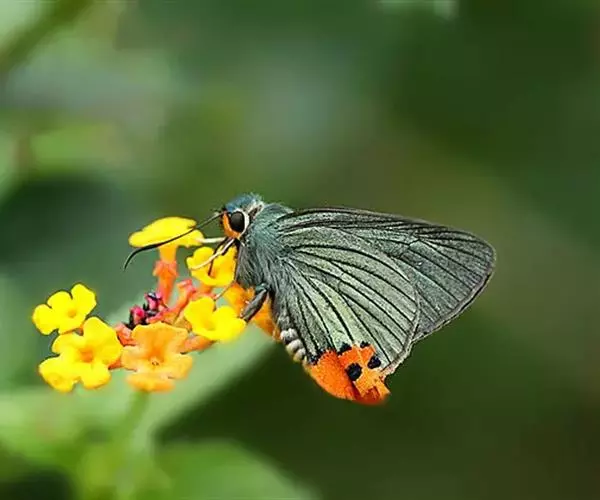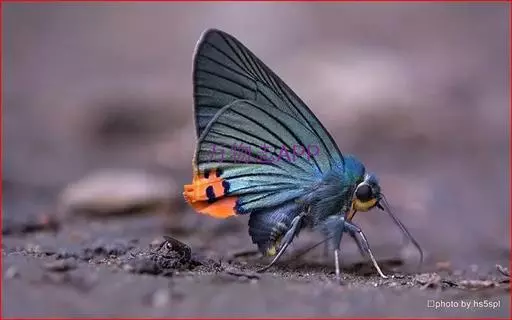 成虫:翅正面暗褐色,基部绿色;后翅臀角沿外缘有橙黄色带。翅反面黄绿色,翅脉黑色; 后翅臀角橙红色斑纹在2a室至cu1室间向内突出。
