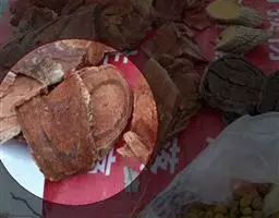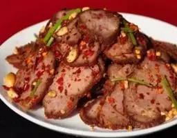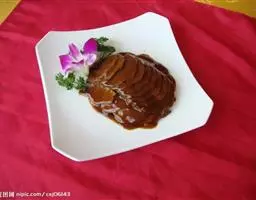 制作: ①将猪肉(五花肉)刮洗干净,放入清水中煮熟,捞出,去皮上的油水。马上抹上深色酱油使其上色。