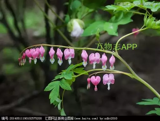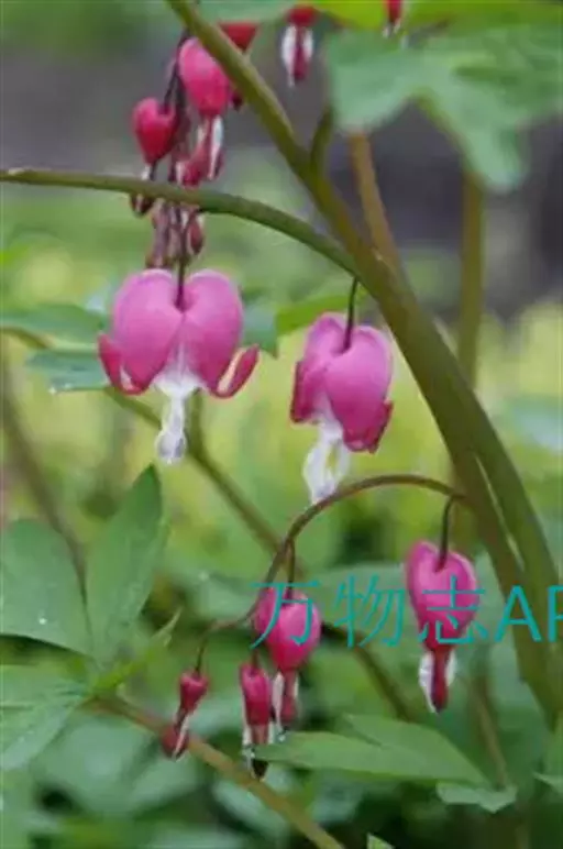 荷包牡丹,(拉丁学名:Dicentra spectabilis (L.) Lem.),为罂粟科、荷包牡丹属多年生草本植物,株高30~60cm。地上茎直立,圆柱形,带紫红色,根状茎肉质,小裂片通常全缘,表面绿色,背面具白粉,两面叶脉明显;叶柄长约10厘米,形似当归。