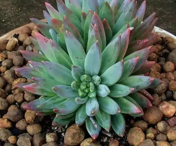 多年生无毛肉质草本植物。丛生。叶丛莲座状。植株叶片呈环状密集排列,基生,扁梭形或卵形,向内弯曲,有叶尖,叶缘圆弧状,叶背有棱线。叶片光滑,表面覆盖微量白粉,叶片草绿色至墨绿色。阳光充足叶片紧密排列边缘和叶尖会黄红。蓝黛莲的花杆很高。簇状花序红色花朵,花朵倒钟形,串状排列,花开五瓣,初夏开花,可异花授粉。 花朵