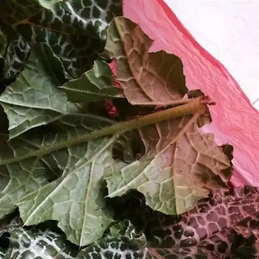 基生叶及下部茎生叶长圆状倒卵形至圆形,长和宽达30厘米。顶端圆形,基部骤窄成极短有宽翅的叶柄,边缘有波状不显明锯齿;上部茎生叶卵形或长圆状卵形,长8-13.5厘米,宽3.5-7厘米,基部抱茎;最上部叶长圆形,长约4.5厘米,宽约1厘米,抱茎。