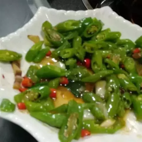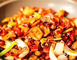 3、再下辣椒、花椒粉炒约半分钟,下兔头不停翻炒;