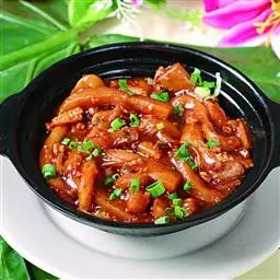4、制作关键。兔头一定选用速冻去皮的为宜,不宜选用带皮的兔头。这是因为带皮的兔头不易入味,且成菜不美观(毛难去尽),一定要先经腌渍、焯水后再卤制,否则腥味较重。腌渍时放硝盐,卤出的兔头才会色泽浅红,风味较佳;但切忌加入过量硝盐,以免对人有害。