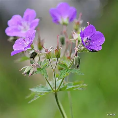 多年生草本,高20-60厘米。根茎短粗,斜生,具簇生纺锤形块根。茎多数,直立,具棱槽,假二叉状分枝,被疏短伏毛或下部近无毛,亦有时全茎被长柔毛或基部具腺毛,叶基生和茎上对生;托叶披针形或卵形,长6-8毫米,宽2-3毫米,先端长渐尖,外被疏柔毛;基生叶和茎下部叶具长柄,柄长为叶片的3-4倍,密被短伏毛,向上叶柄渐短,最上部叶几无柄;叶片七角状肾圆形,长3-4厘米,宽5-6厘米,掌状7深裂近基部,裂片羽状深裂,小裂片披针状条形、全缘,表面被短伏毛,背面被疏柔毛,沿脉被毛较密或仅沿脉被毛。花序腋生和顶生,长于叶,密被倒向短柔毛,总花梗具2花;苞片披针形,长4-9毫米,宽约2毫米,先端长渐尖;花梗与总梗相似,长约为花的2倍,花、果期下弯;萼片卵状椭圆形,长5-7毫米,宽约3毫米,先端具短尖头,背面和边缘被长柔毛;花瓣紫红色,倒长卵形,长约为萼片的1.5倍,先端圆形,基部楔形,密被白色柔毛;雄蕊稍短于萼片,花丝棕色,下部扩展,被睫毛,花药棕色;雌蕊密被短伏毛。种子肾形,具密的微凹小点。花期7-8月,果期8-9月。