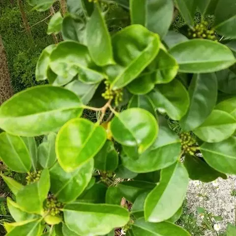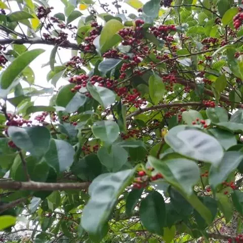 常绿灌木或乔木,高2-10米;树皮灰白色,光滑。小枝圆柱形,灰褐色,平滑,无皮孔,叶痕半圆形,稍凸起,当年生幼枝具纵棱沟,无毛;顶芽圆锥形,芽鳞无毛,具缘毛。叶生于1-3年生枝上,叶片厚革质,卵形或倒卵状长圆形,长4-7厘米,宽1.5-3.5厘米,先端骤然尾状渐尖,渐尖头长6-13毫米,常偏向一侧,基部钝,稀圆形,全缘,叶面深绿色,具光泽,背面淡绿色,两面无毛,主脉在叶面平坦,背面稍隆起,侧脉7-8对,于近叶缘处网结,两面微凸起,明显或不明显,网状脉不见;叶柄长5-9毫米,无毛,上面具纵槽,背面具皱纹;托叶三角形,微小,急尖。花序簇生于二年生枝的叶腋内,苞片三角形,常具三尖头;花4基数,白色;雄花序簇由具3-5花的聚伞花序或伞形花序的分枝组成,无毛,总花梗长3-8毫米,第一次分枝长1-2毫米,或极短,花梗长2-4毫米,无毛,具基生小苞片2枚或无;花萼盘状,直径约1.5毫米,4深裂,裂片三角形,具缘毛;花冠辐状,直径4-5毫米,花瓣长圆形,长约2毫米,宽约1.5毫米,基部稍合生;雄蕊略短于花瓣,花药长圆形;退化子房近球形,直径约1毫米,顶端具不明显的分裂。雌花序簇由具单花的分枝组成,花梗长4-7毫米,无毛,具近中部着生的小苞片2枚;花萼及花冠同雄花;退化雄蕊长为花瓣的1/2,败育花药箭头形;子房卵球形,直径约1.5毫米,柱头厚盘形,疏被微柔毛。果球形,直径约4毫米,成熟后红色,平滑,果梗长3-4毫米;宿存花萼平展,直径约2.5毫米,4裂,裂片具缘毛,宿存柱头厚盘状;分核4,卵状三棱形,长约2.5毫米,背部宽约1.5毫米,背面具稍凸起的纵棱3条,无沟,侧面平滑,内果皮革质。花期5-6月,果期8-10月。