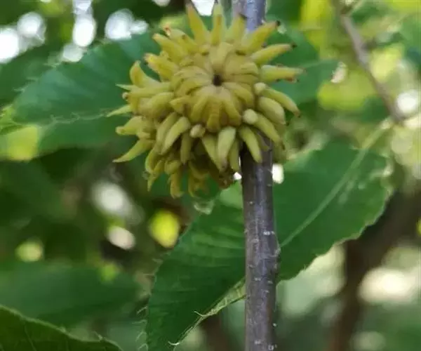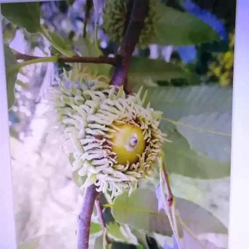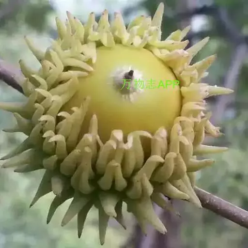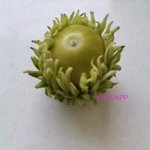坚果近球形或宽卵形,高、径约1.5厘米,顶端圆,果脐突起。花期3-4月,果期翌年9-10月。