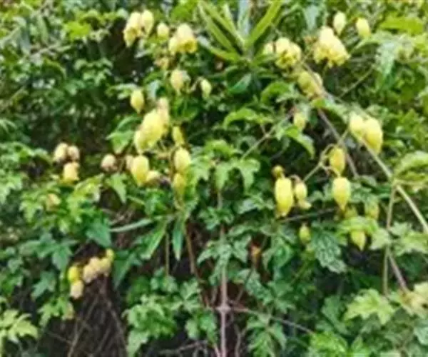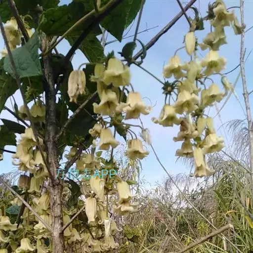 聚伞圆锥花序腋生,与叶近等长,花序梗长7-12厘米,在花序的分枝处生一对膜质的苞片,苞片卵圆形或卵状椭圆形,长1.5-2厘米,全缘或有时3裂;花萼钟状,顶端微反卷,直径1.5-2厘米,芳香;萼片4枚,淡黄色,长方椭圆.形或窄卵形,长1.5-2.5厘米,宽0.5-1厘米,内面无毛,外面被平伏的短柔毛,边缘被白色绒毛; 雄蕊长为萼片之半(长1-1.5厘米),花丝线形,被开展的柔毛,花药黄色,长椭圆形,长2-3毫米;心皮被短柔毛,花柱被绢状毛。