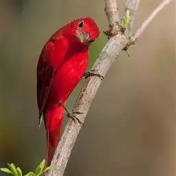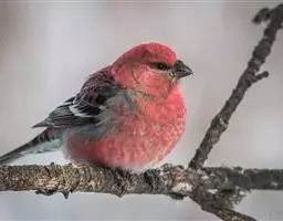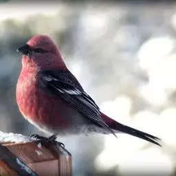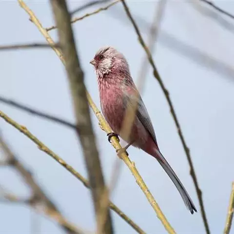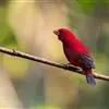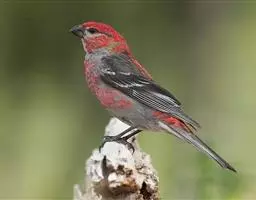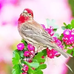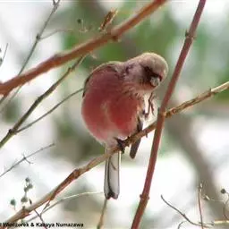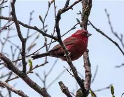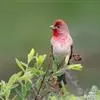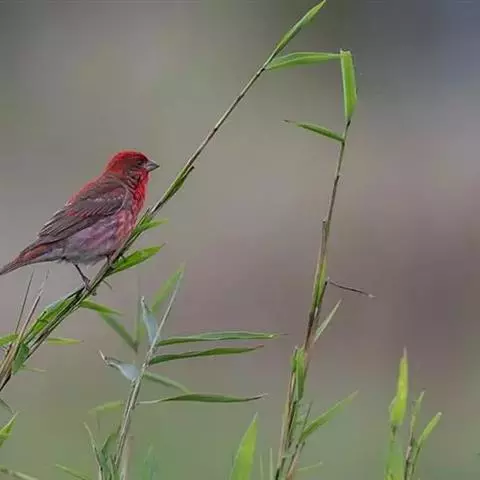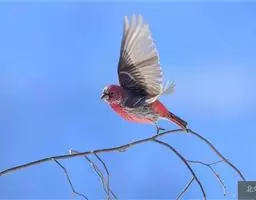 红腰朱雀:体长12-14厘米,小型鸟类。雄鸟前额和眉纹玫瑰粉红色,头顶和一宽的贯眼带深红褐色,背红…