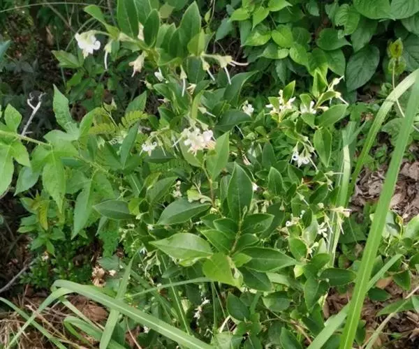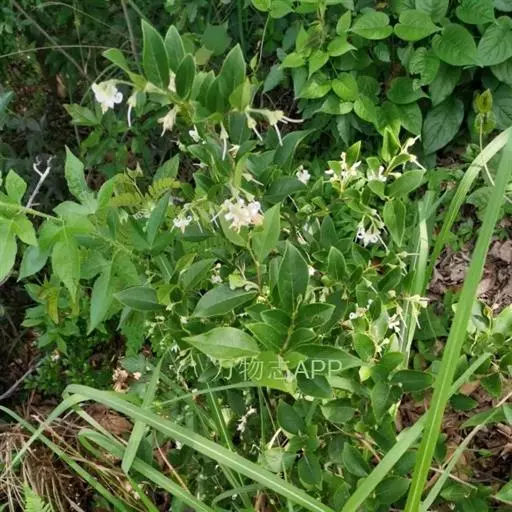白花龙 灌木,高1-2米;嫩枝纤弱,具沟槽,扁圆形,密被星状长柔毛,或被毛渐脱落至完全无毛,老枝圆柱形,紫红色,直立或有时蜿蜒状。幼枝密被星状柔毛。或长圆状披针形,边缘有细锯齿。叶互生,纸质,有时侧枝最下两叶近对生而较大,椭圆形、倒卵形或长圆状披针形,长4-11厘米,宽3-3.5厘米,顶端急渐尖或渐尖,基部宽楔形或近圆形,边缘具细锯齿,当年生小枝的嫩叶两面均无毛至密被褐色或灰色星状柔毛,侧脉每边5-6条,第三级小脉网状,两面均明显隆起;叶柄长1-2毫米,密被黄褐色星状柔毛。总状花序顶生,有花3-5朵,下部常单花腋生,长3-4厘米;花序梗和花梗均密被灰黄色星状短柔毛;花白色,长1.2-1.5(-2)厘米;花梗长8-15厘米,花后常向下弯;小苞片钻形,长2-3毫米,生于花梗近基部,密被灰黄色星状短柔毛,易脱落;花萼杯状,膜质,高4-5(-8)毫米,宽3-4(-6)毫米,外面密被灰黄色星状绒毛和星状短柔毛,萼齿5,三角形或钻形,边缘有时具褐色腺点;花冠裂片膜质,披针形或长圆形,长5-15毫米,宽2.5-3毫米,外面密被白色星状短柔毛,边缘狭的内折或有时同一花中1-2裂片边缘一边内折,另一边平坦,在花蕾时作镊合状排列或呈稍内向覆瓦状排列,花冠管长3-4毫米,无毛;雄蕊长9-15毫米,花丝下部联合成管,上部分离,分离部分的下部密被长柔毛,上部无毛,花药长圆状披针形,长约5毫米;花柱较花冠长,被毛。果实倒卵形或近球形,长6-8毫米,直径5-7毫米,外面密被灰色星状短柔毛,果皮厚约0.5毫米,平滑。花期4-6月,果期8-10月。