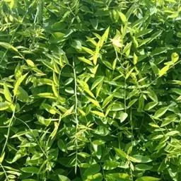 常绿灌木,高1-3米;树冠密集成丛,呈圆球形。茎直立,圆柱形,具细棱,无毛,分枝细长,多分叉,嫩枝绿色,老干灰色。单叶;无托叶;叶柄短,基部平展作鞘状;叶片狭椭圆形至线状披针形,长10-40毫米,宽5-17毫米,纸质,先端钝圆,基部渐狭,上面无毛,下面稀被贴伏柔毛,中脉明显隆起,侧脉不明显;叶片早落。