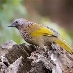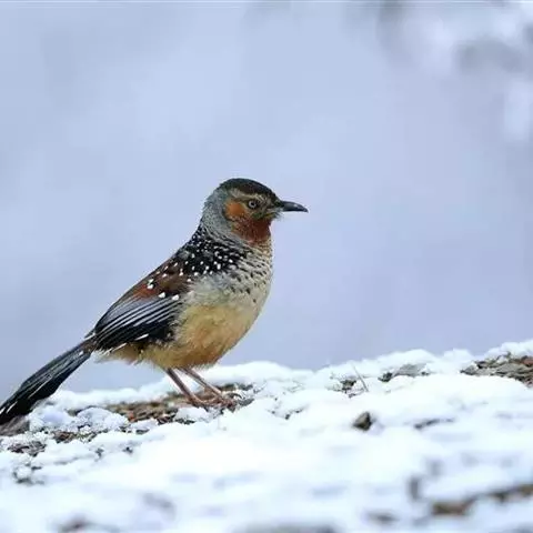 大噪鹛:中型鸟类,体长32-36厘米。额至头顶黑褐色,背栗褐色满杂以白色斑点,…