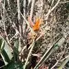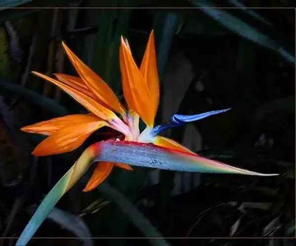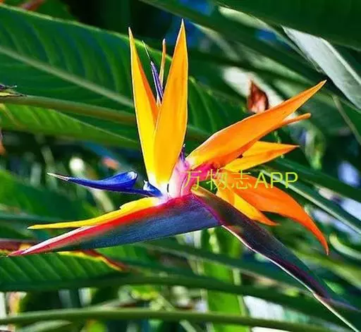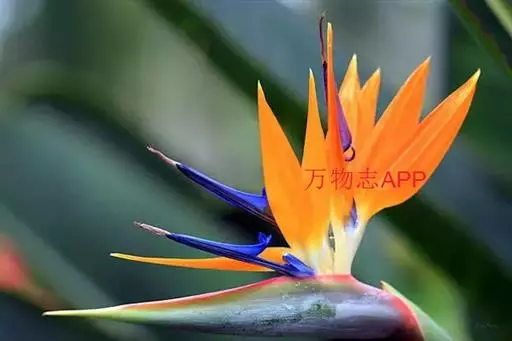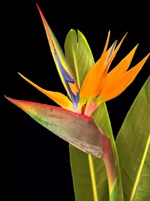 鹤望兰(Strelitzia reginae Aiton)芭蕉科鹤望兰亚科 多年生草本植物,无茎。叶片长圆状披针形,长25-45cm,宽10cm。叶片顶端急尖;叶柄细长。花数朵生于总花梗上,下托一佛焰苞;佛焰苞绿色,边紫红,萼片橙黄色,花瓣暗蓝色;雄蕊与花瓣等长;花药狭线形,花柱突出,柱头3。花期在冬季。