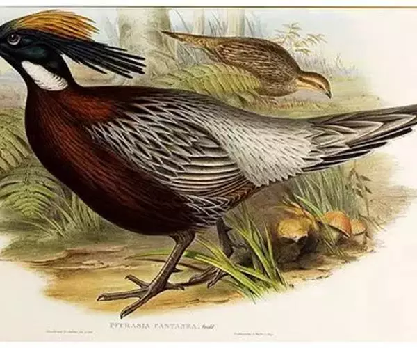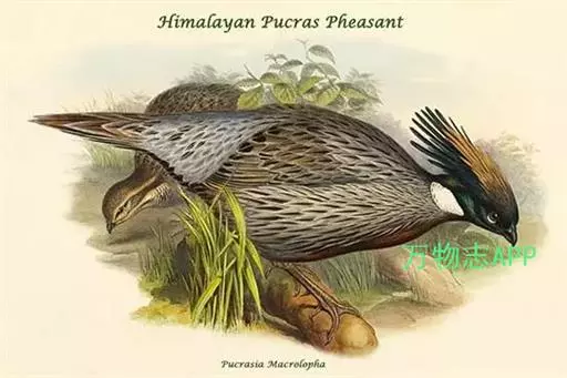 勺鸡(学名:Pucrasia macrolopha):体长390-630毫米,体重750-1100克。体形适中,头部完全被羽,无裸出部,并具有枕冠。第1枚初级飞羽较第2枚短甚,第2枚与第6枚等长;第4枚稍较第3枚为长,同时也是最长的。尾羽16枚,呈楔尾状;中央尾羽较外侧的约长一倍。跗蹠较中趾连爪稍长,雄性具有一长度适中的钝形距。雌雄异色,雄鸟头部呈金属暗绿色,并具棕褐色和黑色的长冠羽;颈部两侧各有一白色斑;体羽呈现灰色和黑色纵纹;下体中央至下腹深栗色。雌鸟体羽以棕褐色为主;头不呈暗绿色,下体也无栗色。