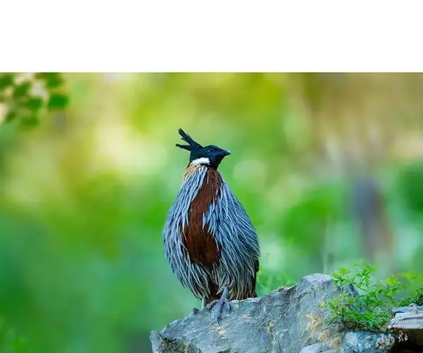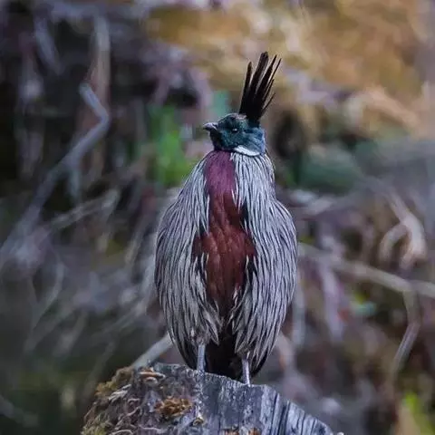 头顶棕褐,冠羽细长,同色而较棕,再后有更长的黑色而具辉绿色羽缘的枕冠向后延伸;颈侧在耳羽后面下方有一大形的白色块斑(约20×30毫米);下眼睑具一小白斑;头的余部包括颏、喉等均为黑色,而带暗绿色的金属反光;喉部反光较差淡;颈侧白斑后面及背的极上部均淡棕黄色,形成领环状,羽片中央贯以乳白色纵纹;上体羽毛呈披针形,概紫灰色,内外翈各具一个黑色沾栗的稍阔纵条,两者合成“V”形,两者之间并具虫蠹状黑斑所成的纵条一对,沿着白色羽干的两侧