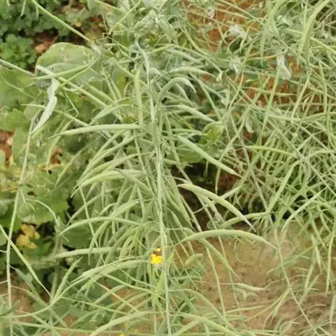 花浅黄色,直径7-8毫米;萼片披针形或长圆卵形,长约6毫米;花瓣倒卵形,长8-10毫米,顶端微凹,有细爪。长角果线形,长3-5厘米,稍侧扁,喙圆锥形,长5-7毫米;果梗长5-8毫米。