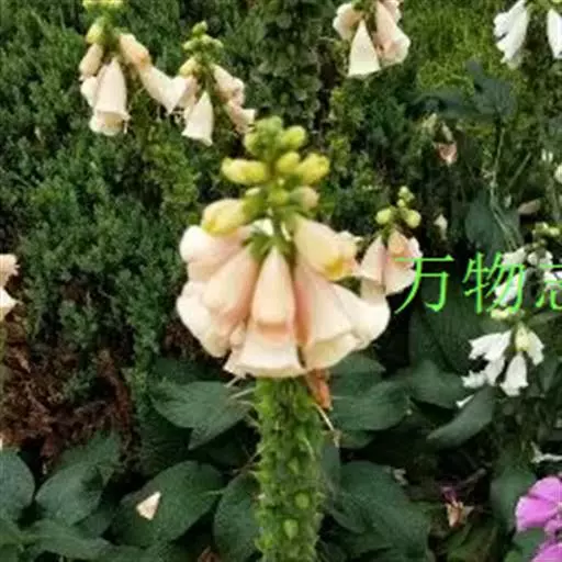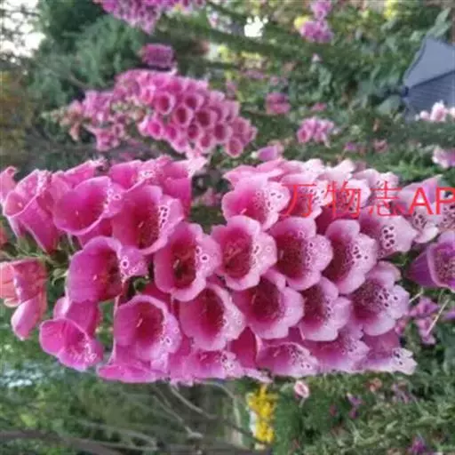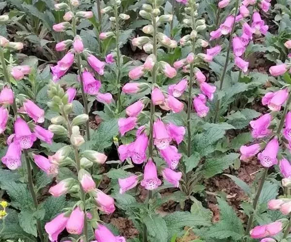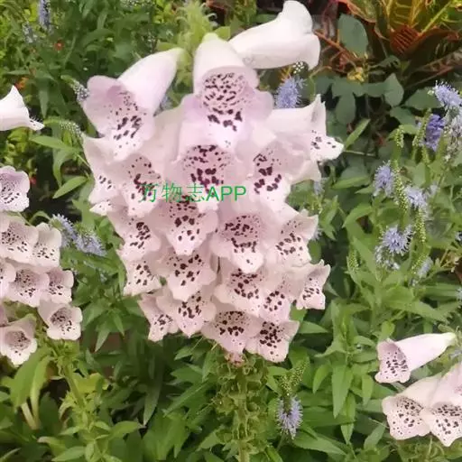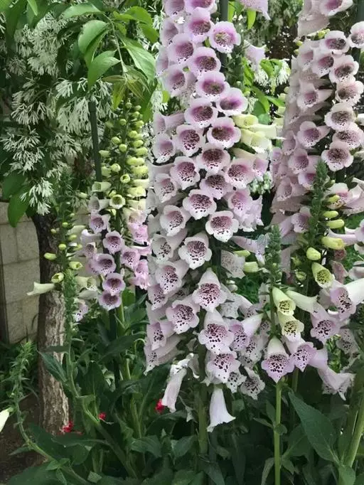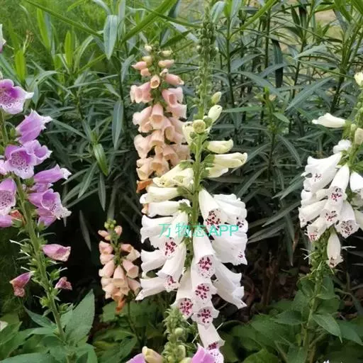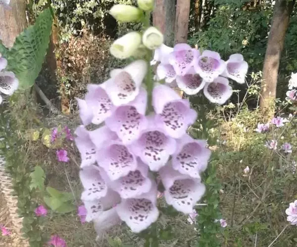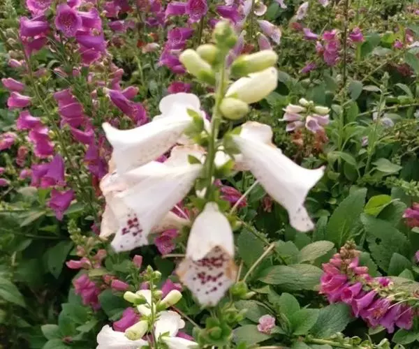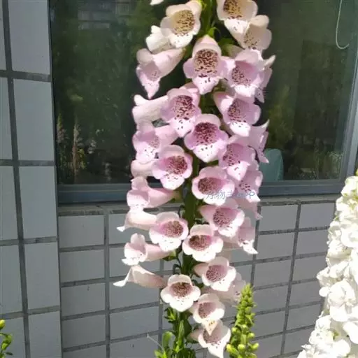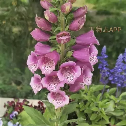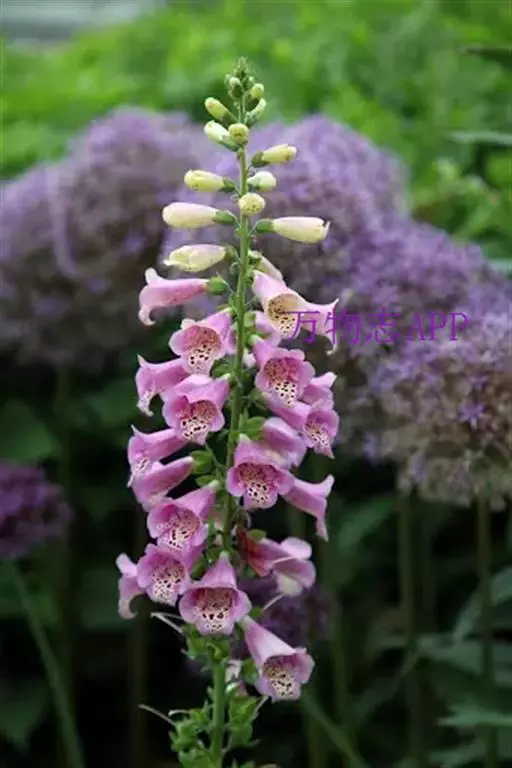 毛 地黄(Digitalis purpurea L) :为玄参科、毛地黄属二年生或多年生草本植物。除花冠外,全体被灰白色短柔毛和腺毛,有时茎上几无毛,高60-120厘米。茎单生或数条成丛。叶片卵圆形或卵状披针形,叶粗糙、皱缩、基生叶具长柄,卵形至卵状披针形,叶缘有圆锯齿,叶柄具狭翅,叶形由下至上渐小。顶生总状花序长50~80cm,花冠钟状长约7.5cm,花冠蜡紫红色,内面有浅白斑点。蒴果卵形,花期5~6月,果熟期8~10月,种子极小。人工栽培品种有白、粉和深红色等,一般分为白花自由钟,大花自由钟,重瓣自由钟。常用于花境、花坛及岩石园中,还可作自然式花卉布置。