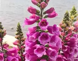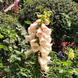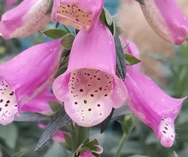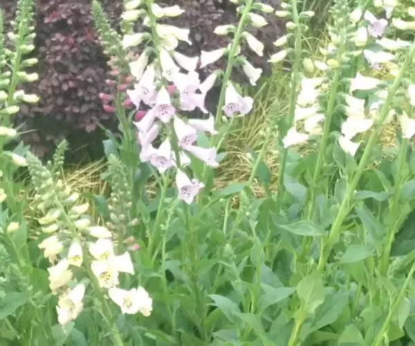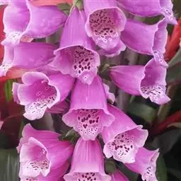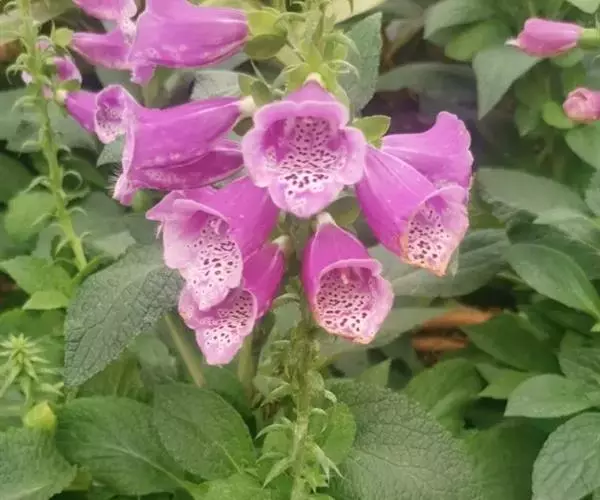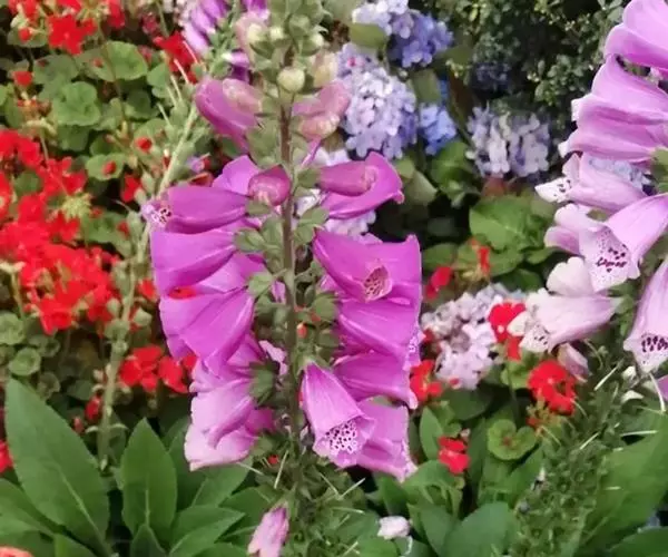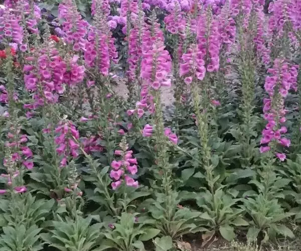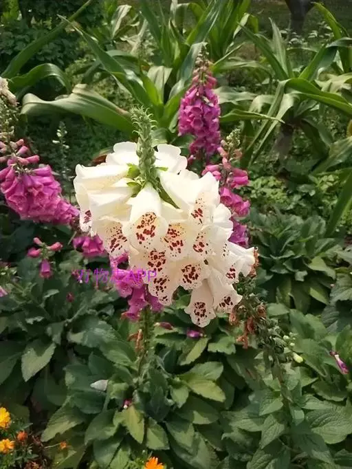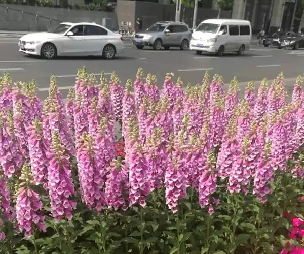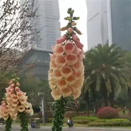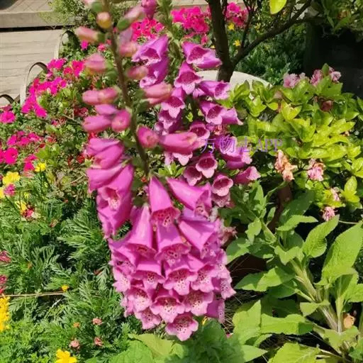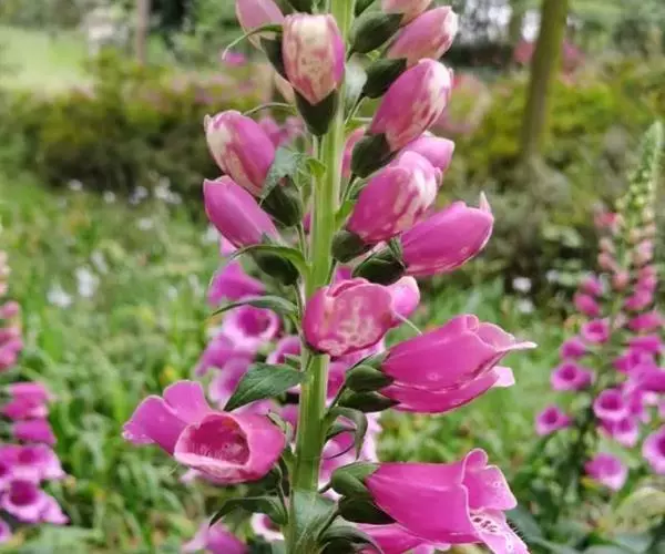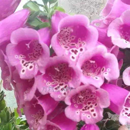 毛 地黄(Digitalis purpurea L) :为玄参科、毛地黄属二年生或多年生草本植物。除花冠外,全体被灰白色短柔毛和腺毛,有时茎上几无毛,高60-120厘米。茎单生或数条成丛。叶片卵圆形或卵状披针形,叶粗糙、皱缩、基生叶具长柄,卵形至卵状披针形,叶缘有圆锯齿,叶柄具狭翅,叶形由下至上渐小。顶生总状花序长50~80cm,花冠钟状长约7.5cm,花冠蜡紫红色,内面有浅白斑点。蒴果卵形,花期5~6月,果熟期8~10月,种子极小。人工栽培品种有白、粉和深红色等,一般分为白花自由钟,大花自由钟,重瓣自由钟。常用于花境、花坛及岩石园中,还可作自然式花卉布置。
