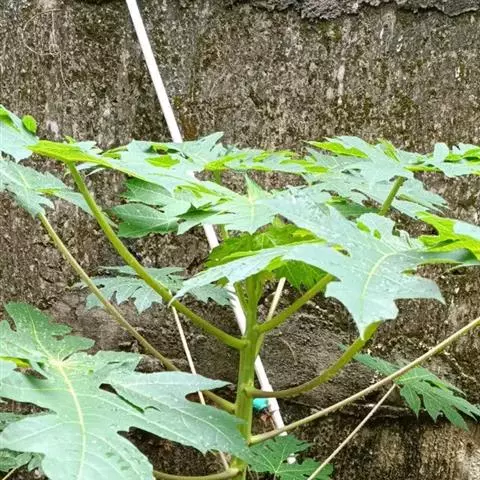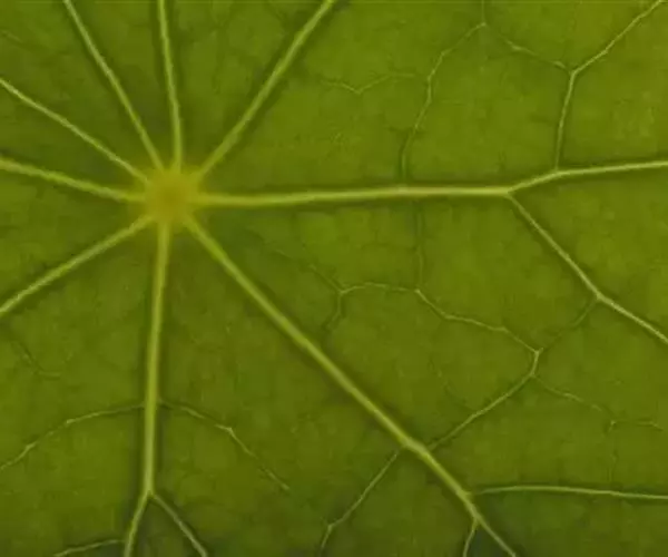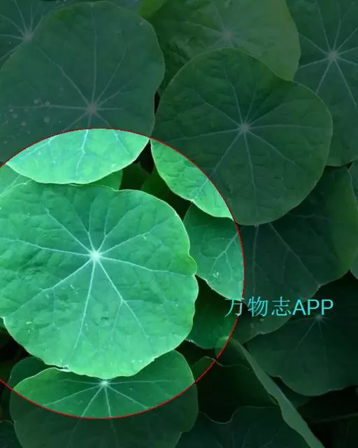 叶互生;叶柄长6-31厘米,向上扭曲,盾状,着生于叶片的近 中心处;叶片圆形,直径3-10厘米,有主脉9条.由叶柄着生处向四面放射,边缘为波浪形的浅缺刻,背面通常被疏毛或有乳凸点。