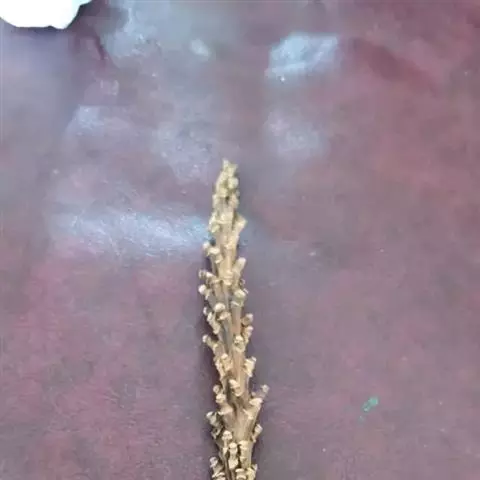 花枝下垂,每节可簇生3-4枚假小穗位于无毛钝圆头之苞片腋间;假小穗稍作两侧扁,无毛,长约13毫米;苞片2-4片,披针形,先端具小尖头;外稃卵状披针形,质地较苞片为薄,亦具小尖头;内稃席卷,无脊,先端渐尖,也呈小尖头状;鳞被2,形狭窄,线状长圆形,先端钝圆而具啮蚀状之流苏,基部具3-5条脉纹;