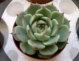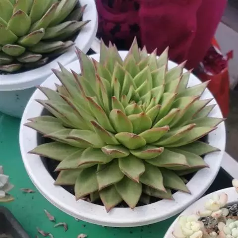 大和锦是景天科拟石莲花属的多肉植物。肉质叶排成紧密的莲座状,广卵形至散三角卵形,背面突起呈龙骨状,…