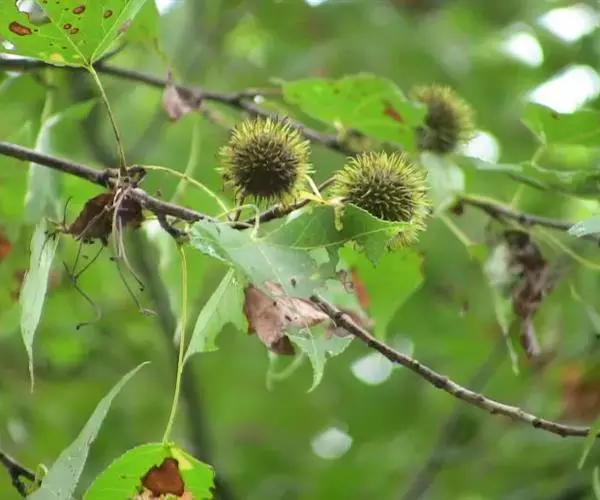 枫香树(图3) 在进行种子的采集时应选择生长10年以上、无病虫害发生、长势健壮、树干通直的优势树作为采种母树。枫香花4月上旬开花,10月下旬果实成熟。果穗球形,径2.5~3.5厘米,由多数蒴果组成。每一蒴果仅有1~2枚可孕的黑色种子,顶端具倒卵形短翅。可孕的种子有翅,为黑色;不孕种子无翅,为黄色,较淡。果实成熟后开裂,种子易飞散。当果实的颜色由绿变成黄褐(稍带青)、尚未开裂时,应将其击落,以便于收集。回的果实应置于阳光下进行晾晒,一般3~5d即可。在晾晒的过程中,应常用木锨翻动果实,待蒴果裂开后将种子取出。然后用细筛除去含有的杂质即可获得纯净的枫香种子。。以鲜果的重量进行计算,出种率为1.5%~2.0%。采集的种子应装于麻袋内置于通风干燥处进行储藏。 [3-4]