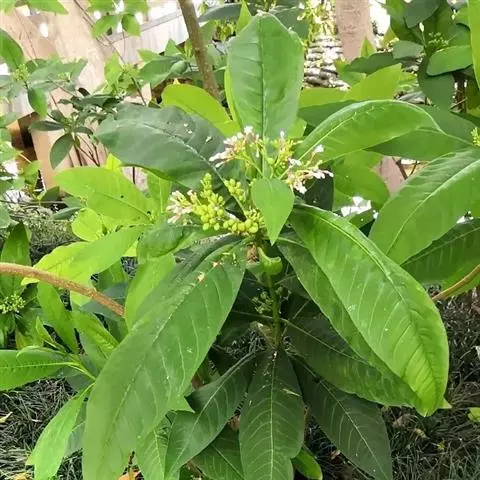 乔木,高达15米;枝条无毛,淡绿色。叶革质,卵状长圆形,长8-22厘米,宽4-8.5厘米,两面无毛,略具光泽,顶端急尖,基部阔楔形;侧脉每边10-18条,明显;叶柄长5-7毫米。聚伞花序顶生,长约7厘米;苞片长7毫米,披针形,渐尖,两面被灰色微毛;花萼裂片长圆状披针形,长4-6毫米,宽2毫米,边缘有缘毛,两面被微毛;花冠白色,花冠筒长2.5厘米,内面喉部被长柔毛,裂片长圆形,长1.5-2厘米,宽4-5毫米;花药长圆状披针形,基部圆;花盘匙形,比心皮长,长1.5毫米,宽0.7毫米;子房由2个离生心皮组成,长1毫米,被短柔毛,花柱细长,柱头棍棒状,每心皮有胚珠2颗。核果未熟时绿色,成熟后变黑色,近椭圆形,长2.5厘米,直径1.5厘米,顶端圆形;种子1-2颗,长1.5厘米,直径5毫米。花期4-6月,果期7-12月。