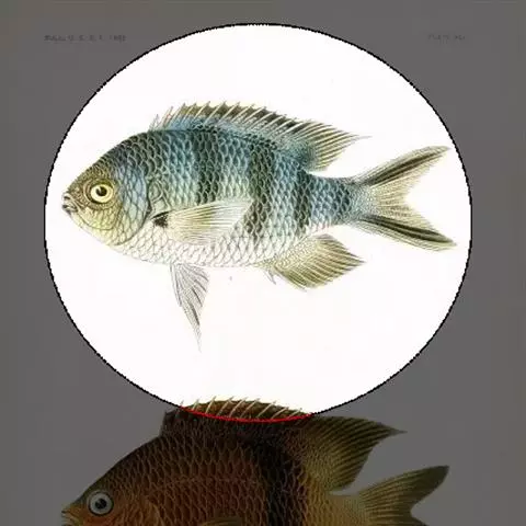 眼斑双锯鱼,背鳍硬棘被橘黄色斑块分割为5-6枚,第4枚最长,约为头长的2.1-2.9倍。胸鳍、臀鳍…