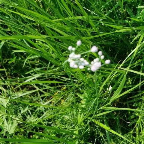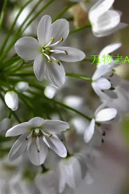 伞形花序球状,无珠芽,具多而密集的花;小花梗近等长,比花被片长数倍,基部具小苞片;花白色至淡紫色;花被片近矩圆形,长4.5~5毫米,宽2~2.3毫米,先端钝,具短尖头,中脉绿色,外轮的背面沿中脉具细齿;花丝稍比花被片长,基部合生并与花被片贴生,两侧的下部具细齿,内轮的下部约2/3扩大成长方形,扩大部分与花被片近等宽,每侧各具1齿,齿端延长成卷曲的丝状,远比中间着药的花丝长,外轮的无齿,下部稍扩大成狭长的条状三角形;子房卵球状,在中下部沿腹缝线具横向隆起的蜜腺(在标本上不易观察到);花柱伸出花被外。花果期5-7月。