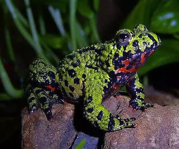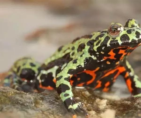 东方铃蟾(学名:Bombina orientalis)是铃蟾科、铃蟾属两栖动物。体长36-48毫米左右头扁平,吻圆,前、后肢短,皮肤粗糙,刺黑色,背部呈灰棕色,或背为绿色杂以不规则的黑色斑点,腹面有花斑,为黑色与朱红色或桔黄色。雄性前肢较粗壮,前臂直径为体长的11%(雌性8.4%),前臂内侧、内掌突及内侧3指基部有黑色细刺;无声囊和雄性线。雄性趾间为全蹼,雌性的蹼缺刻较深。
